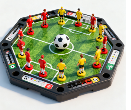 It adopts a hexagonal three-dimensional frame and has a built-in simulated green lawn court, with clear football field lines (midline, penalty area, goal area, etc.) marked to restore the real stadium layout. It is equipped with red and yellow teams of player figurines (including goalkeepers). The players are distinguished by bases of different colors at the bottom, and matched with a classic black-and-white football, creating a strong sense of sports atmosphere visually.